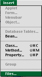 - Now we’ve got a project file and a Java source file, but the Java source isn’t included in the project yet. To add files to the project, choose Files… from the Insert menu: