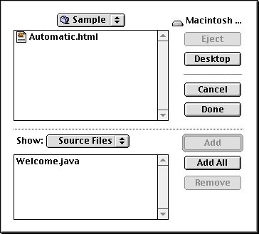- Click the Welcome.java file from your Sample folder, and then click Add. Next, click Done and you’ve added the file to the project. Your project window should now look like: