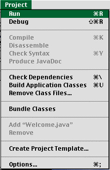 Although you’ll sometimes start from scratch, you might also want to run the example code which is included in the book. All of the example code is stored on the Maclab server (Maclab Resources) in the folder Courses:Spring 1998:CS102-02:examples. (By the way, you can start Visual Café by double-clicking any of the files in the examples folder.) With the examples, the code is already written, but you still need to build a project. The steps are similar, but there are a few differences.