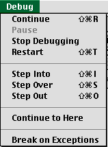 The Debug menu choices control when your program starts and stops, and are summarized in the table below.