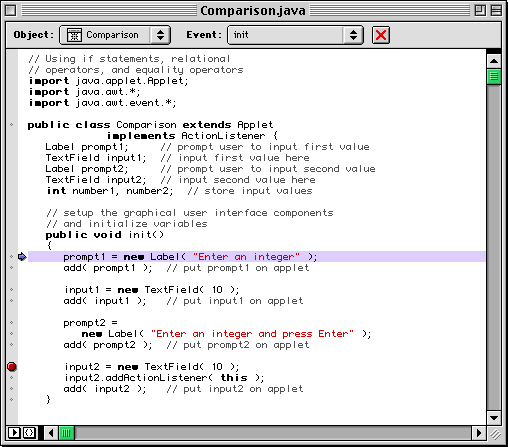 The highlighted line is the Java line about to be executed. If you look on the left-hand side of the image above, you’ll see a gray strip with dots at each line and a big red dot on one line. The red dot represents a breakpoint, which means that once program execution reaches that point, it will stop and return to the debugger (from the Applet Runner). If you click on a gray dot, it will change to a breakpoint, and if you click on a breakpoint, it will revert to a red dot.