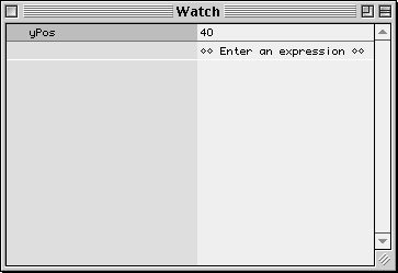 You’ll usually want to use breakpoints together with Watch variables. The Watch window, shown in the image below, displays a list of variables and their current values. (You can display the Watch window by choosing Watch from the Windows menu, or with Shift-Command-W.)