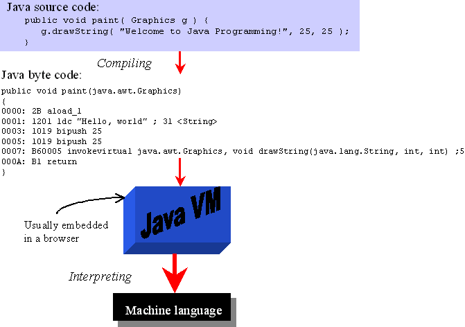In the Introduction to Java lecture, I mentioned that Java isn’t the native language of most computers: Java has to be translated into a form that the computer can understand. One of the things that make Java run anywhere (or almost anywhere) is that Java source code (what you write) is translated into Java bytecode. The bytecodes are stored in a special binary file format, called a class file. When you run a Java program, the program is loaded into a Java virtual machine (a.k.a. a "Java VM"), and the bytecodes are translated in to machine language. (Many other languages, such as C++ or C, but not Perl, go from source code straight to machine language.) The figure below summarizes the process: