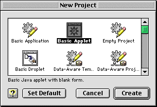 Click on Basic Applet, then choose ‘Create’. You’ll see two windows appear: an untitled Visual Café project window and an applet window: