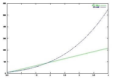 (a-0.4)60That is, we need 0.4 square centimeters to do anything useful at all, and then we can increase the value of our design by $60 for each additional square centimeter. Here is a graph of the cost per die and the value per die: