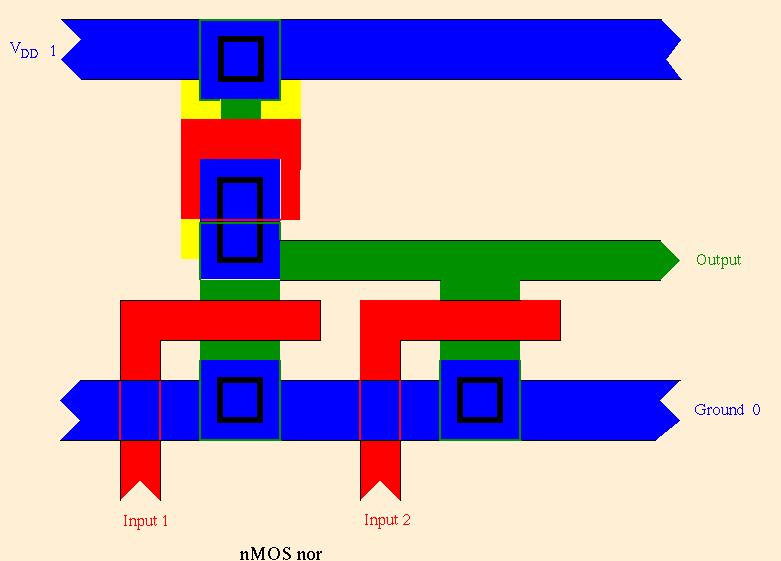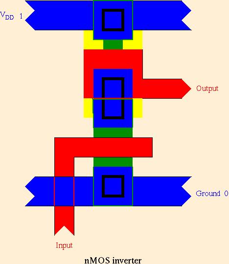 The left-right blue wire at the top must be connected to a voltage source providing VDD. The other left-right blue wire at the bottom must be connected to the ground voltage. The input to be inverted comes in on the red wire from the bottom, which crosses under the blue ground wire with no connection. There is a broad green area going up from a contact cut with the blue ground wire. Where the red input crosses this green region, we get an enhancement mode transistor. A voltage significantly higher than ground on the input (representing a Boolean 1) connects the green regions above and below the red input, so the middle of the circuit is pulled close to the ground voltage (Boolean 0). This lower transistor is called the ``pulldown'' transistor. The contact cut in the middle connects the upper part of the pulldown transistor to the red wire in the middle, which feeds off to the right as the output. So, it's pretty clear that a 1 input should produce a 0 output.