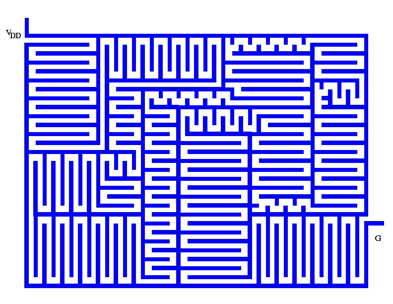 In nMOS circuits, Boolean 0s are represented by voltages near numerical 0 (ground). There is another special voltage, called VDD (the two Ds are subscripts, but I haven't yet generated an image for that symbol: look on the picture in the next section), and voltages near VDD represent Boolean 1s. The normal design style in nMOS circuits uses lots of parallel blue metal wires carrying VDD voltage, interleaved with parallel blue metal wires carrying ground voltage. The computing action takes place in the green and red layers between these metal wires.
