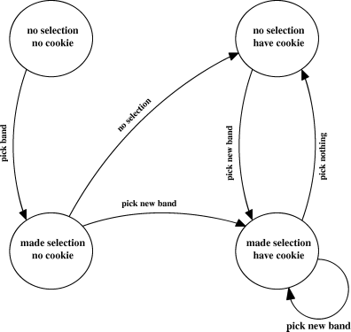 I sure hope not. You should instead think of ways to abstract that down. The example I gave last week with the favorite band is a pretty good illustration. In reality, there are a lot of states and transitions -- in fact, at least three states for each favorite band and a whole lot of transitions. This is all due to the fact that the favorite band could be set to a number of things. But it could be a lot simpler if we realize this: who cares what the favorite band is? We only care if we've picked one or not.