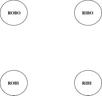 Each one of these is a particular state. Computer science theorists draw graphs of states, with each state being a node (a circle). So let's do that, labeling our states ROBO, RIBO, ROBI, and RIBI (Red In/Out, Blue In/Out).