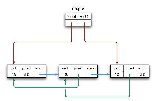(define-struct deque (front ;; either a (deq-nd X) or #f rear)) ;; either a (deq-nd X) or #f (define-struct deq-nd (val ;; the node's value (type X) pred ;; the node's successor; either a deq-nd or #f succ)) ;; the node's predecessor; either a deq-nd or #f