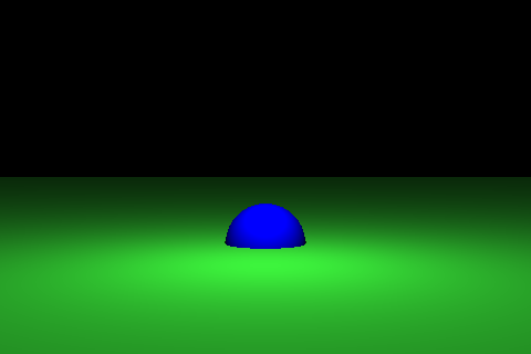 (define test-camera-3 (make-camera -2 480 320)) (define test-plane-1 (make-plane (make-vec3 0 1 0) 1 (make-surface (make-rgb 0.2 0.8 0.2) (make-rgb 0 0 0) 1))) (define test-sphere-5 (make-sphere (make-vec3 0 -1 6) 0.6 (diffuse-surf 'blue))) (define test-scene-4 (make-scene (make-rgb 0 0 0) (list test-plane-1 test-sphere-5) (list (make-point-light (make-vec3 0 1 4) (name->rgb 'white))) (make-rgb 0.2 0.2 0.2)))