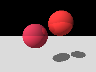 (define test-camera-4 (make-camera -1 320 240)) (define test-scene-5 (make-scene (make-rgb 0 0 0) (list (make-plane (make-vec3 0 1 0) 3 (diffuse-surf 'white)) (make-sphere (make-vec3 -1 0 3) 1 (make-surface (make-rgb 0.7 0.2 0.3) (make-rgb 0.2 0.04 0.06) 1)) (make-sphere (make-vec3 1 1 3) 1 (make-surface (make-rgb 0.8 0.2 0.2) (make-rgb 0.2 0.04 0.04) 1))) (list (make-dir-light (v3-normalize (make-vec3 -1 1 -1)) (make-rgb 0.8 0.8 0.8))) (make-rgb 0.4 0.4 0.4)))