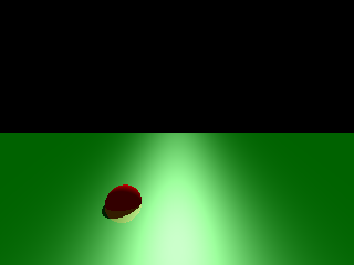 (define test-scene-6 (make-scene (make-rgb 0 0 0) (list (make-plane (make-vec3 0 1 0) 2 (make-surface (make-rgb 0 0.6 0) (make-rgb 1 1 1) 20)) (make-sphere (make-vec3 -1.5 -2 4) 0.5 (diffuse-surf 'red))) (list (make-dir-light (v3-normalize (make-vec3 0 2 3)) (make-rgb 0.8 0.8 0.8))) (make-rgb 0.2 0.2 0.2)))