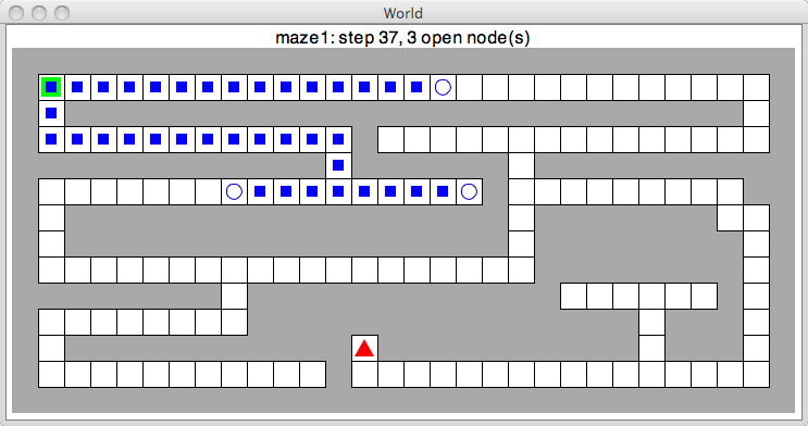 You rendering code should mark the open and closed nodes and should report on the current state of the search (i.e., how many steps have been taken, etc.). When the search has completed successfully, it should render the resulting path.