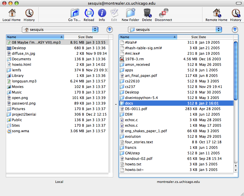 You'll see there are two panes. The left pane lists files in a default directory on your local computer. On the right is a listing of files in your home directory on the computer you just logged into. Chances are, if you just signed up for your CS account, you won't have nearly as much junk in your directory. Over the left pane there is a bar that says "Sesquis", which will read with whatever your username on your local machine is. Click that to change your local directory to locate the files you want to upload. Just drag the files over to the right pane (remote computer), and you'll see the files appear!