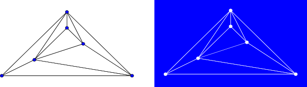 A plane drawing of a graph (left), and the 8 faces defined by the planar embedding (right.) Each connected blue region in the image on the right is a face. The large blue region surrounding the graph is the outer face.
