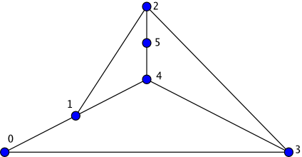 In a biconnected graph, like the one shown above, each face is bounded by a cycle and each edge belongs to exactly two faces. For this reason, when planar_face_traversal is called on a biconnected graph, each edge will be visited exactly twice: once on each of two distinct faces, and no vertex will be visited more than once on a particular face. The output of planar_face_traversal on non-biconnected graphs is less intuitive - for example, if the graph consists solely of a path of vertices (and therefore a single face), planar_face_traversal will iterate around the path, visiting each edge twice and visiting some vertices more than once. planar_face_traversal does not visit isolated vertices.