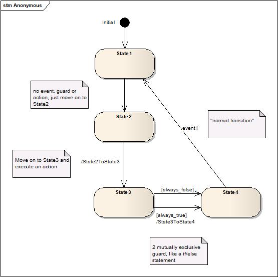 This also means that you can, like in the transition table, write entry / exit actions made of more complicated action combinations. The previous example can therefore be rewritten.