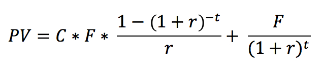 In short, the bond's current market value is equal to the face value plus the present value of interest payments. For example, let us assume bond κ to be a $100,000 10 year bond compounded annually (a coupon frequency of 1 payment/year), and a coupon of 8% per year. The prevailing market interest rate we will assume is 2.5%. In this scenario, F = 100,000, C = .08, r is .025, and t is 10 (years). Using the formula above, the present value of bond κ would be $148,136. As another example, assume bond γ to be a $10,000 5 year bond compounded semi-annually (a coupon frequency of 2 payment/year), and a coupon of 8% per year. The prevailing market interest rate we will assume is 2.5%. In this scenario, F = 10,000, C = .04 (=8% / 2 periods/year), r is .025, and t is 10 (=5 years * 2 periods/year). The present value of bond γ would be $11,313.
