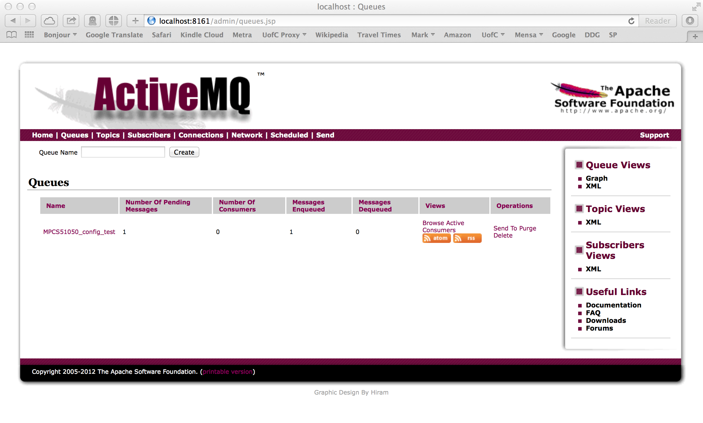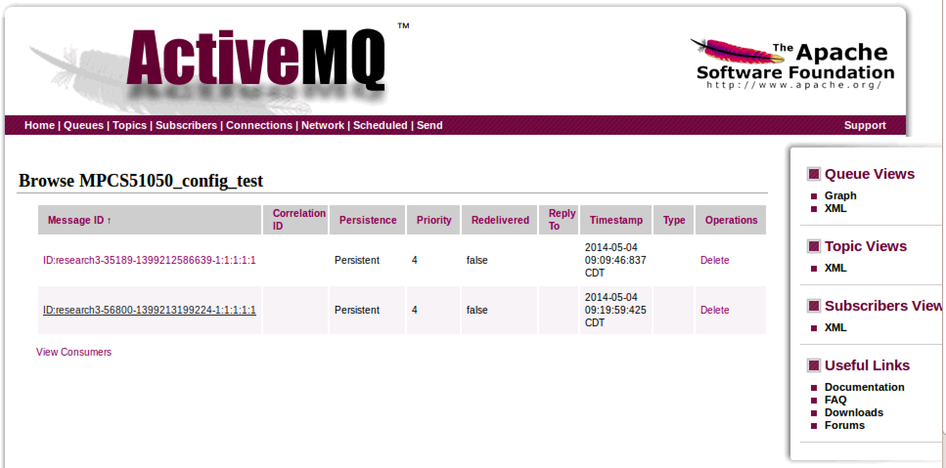 You should not see any errors. At this point, you should be able to execute the project in eclipse. You should now go back into your ApacheMQ console, and you should refresh the pages and verify that you now have two messages in your MPCS51050_config_test queue: