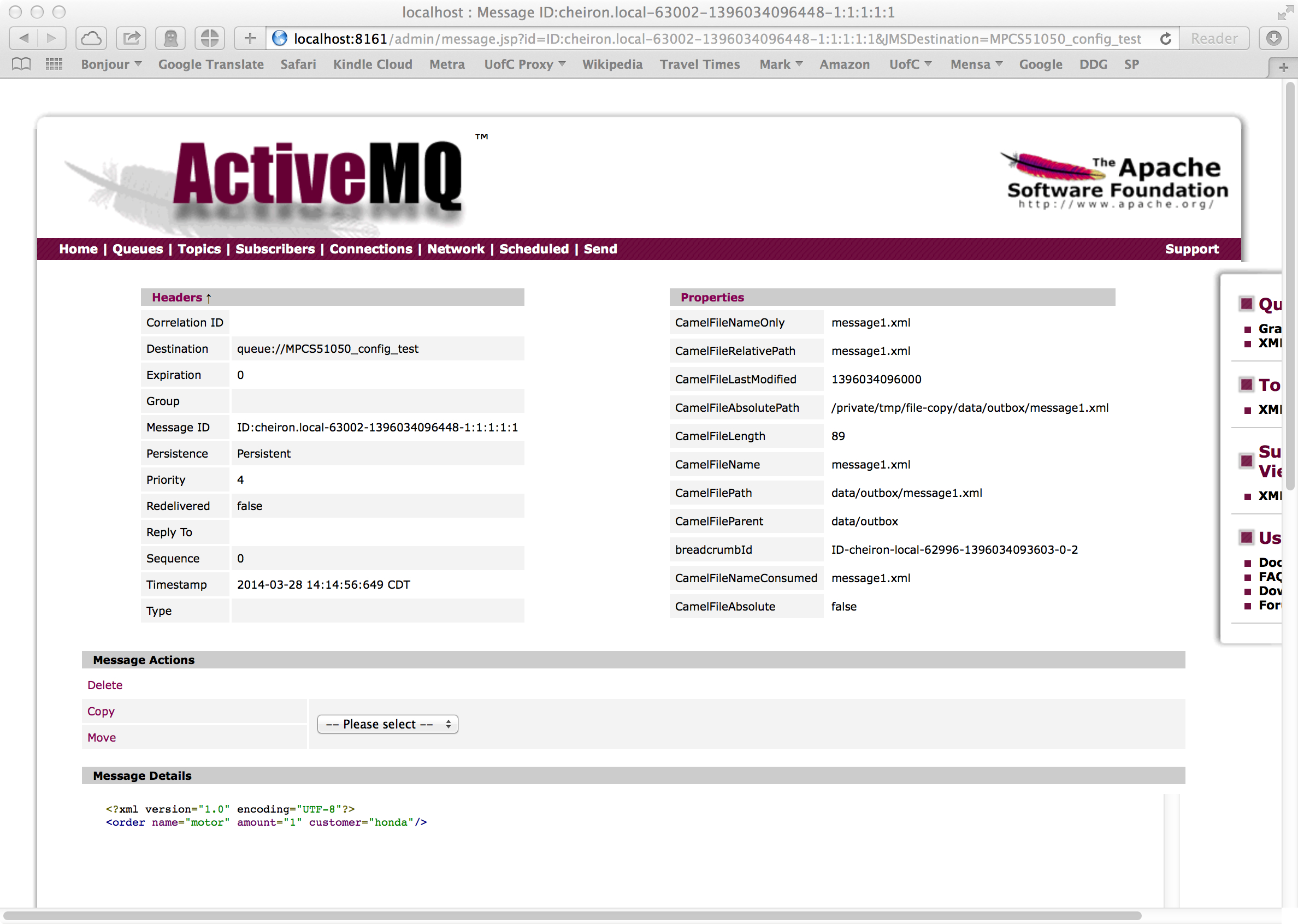 Seeing that you now have a new queue (created by your file-copy program) called MPCS51050_config_test, and that it has one message on the queue (Number of Pending Messages) is a GREAT THING. You're almost done. You can even click on the queue name and on the next screen click on the message identifier to investigate the actual message: