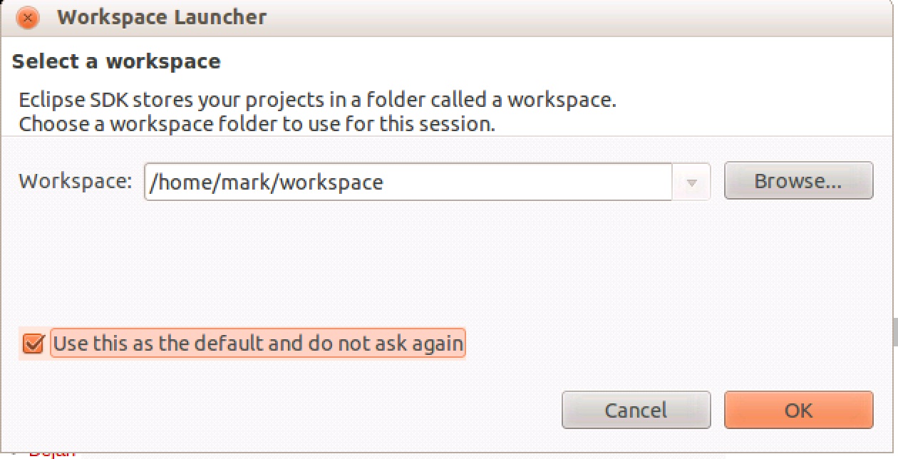 workspace to /home/[yourloginid]/workspace and make sure you check the "Use this as the default and do not ask again" option. Click on "OK".