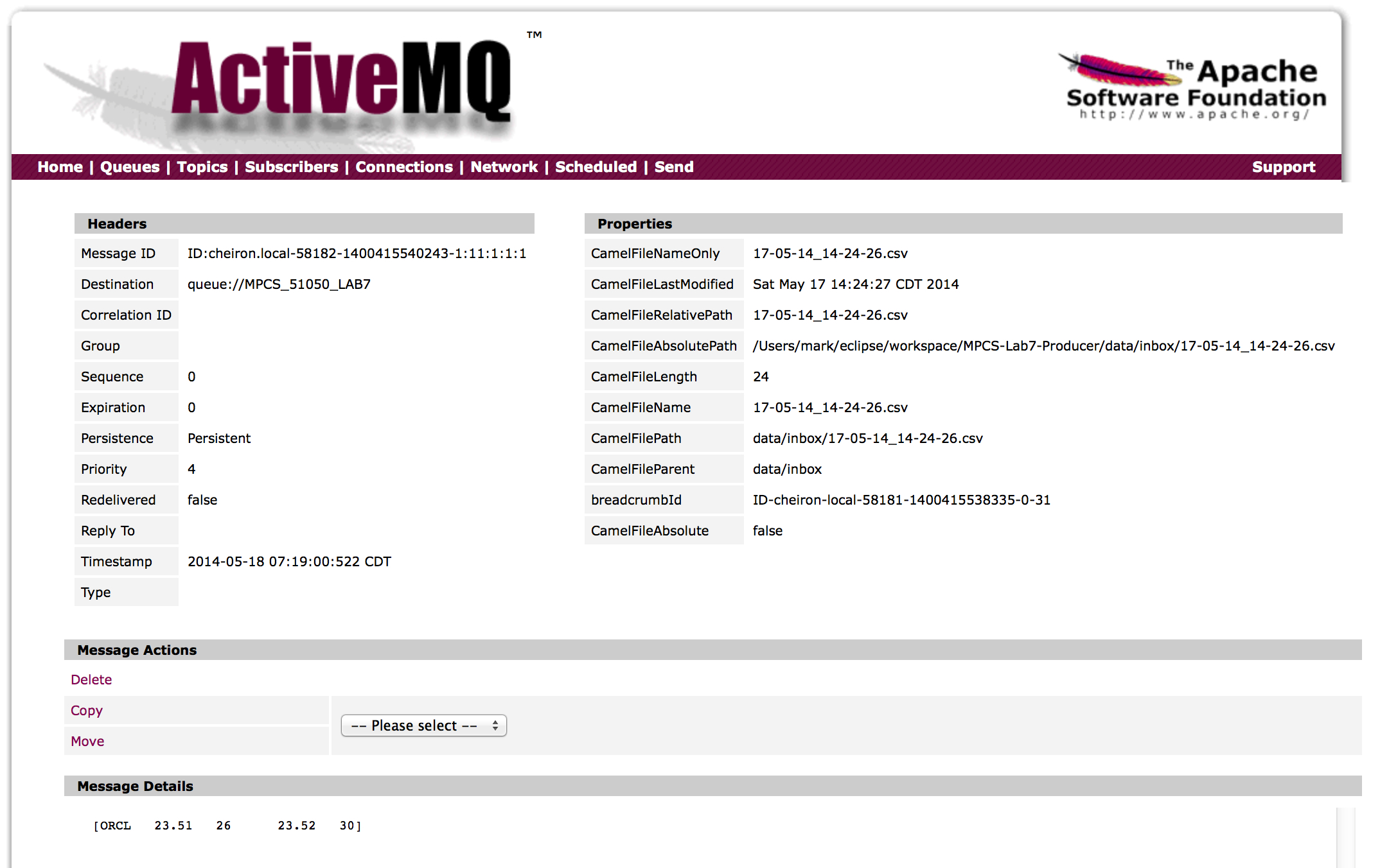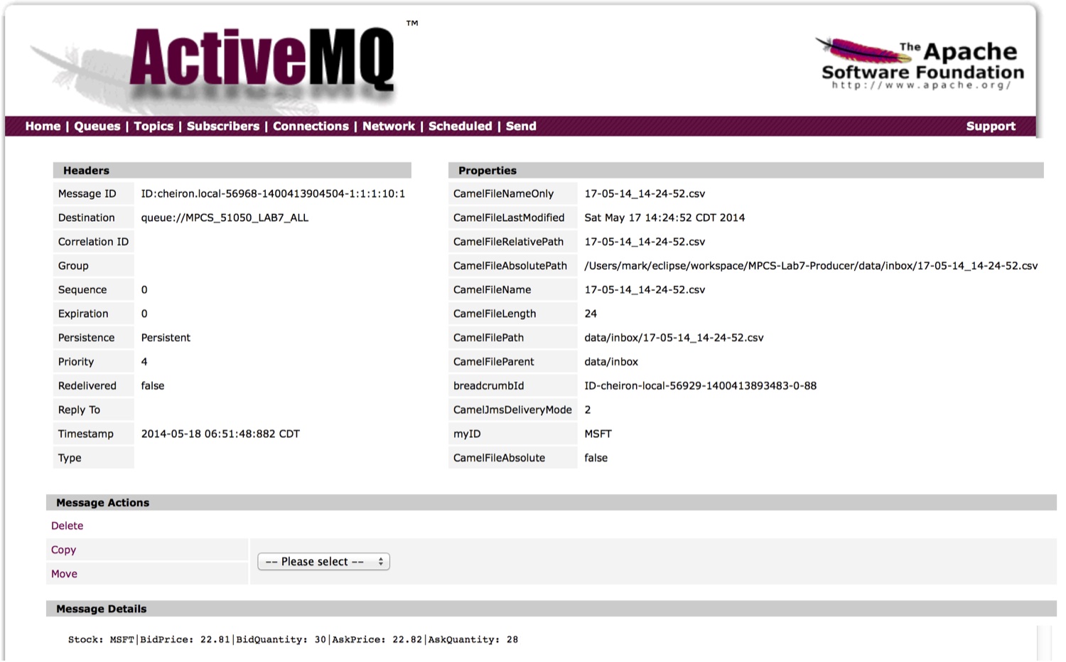 CamelFileName along with the stock in the file in this format: "MESSAGE FROM FILE: 17-05-14_14-24-13.csv is heading to MPCS_51050_LAB7 Queue for Stock: IBM"