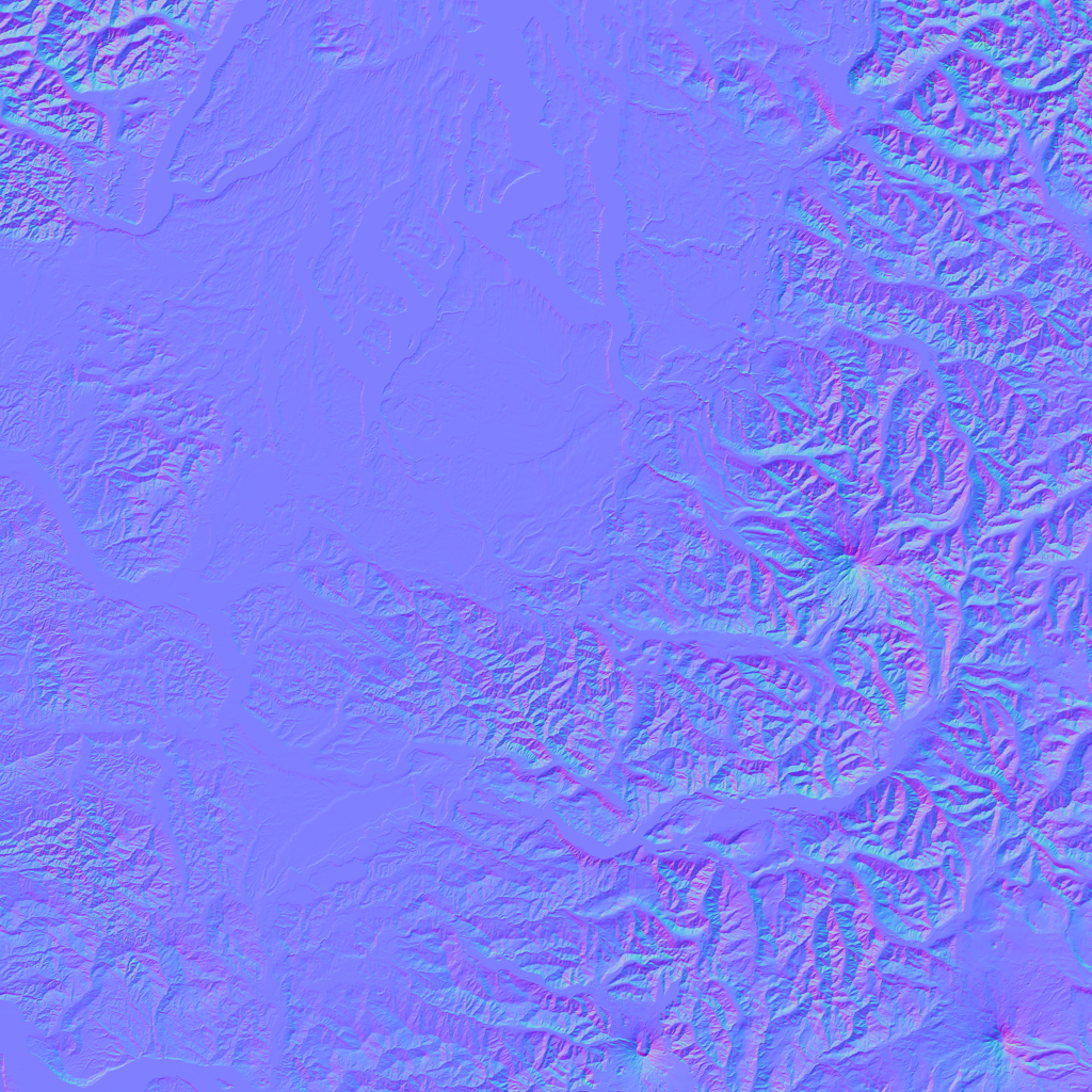 This test map is based on data for the Puget Sound region of Washington state. It has has both flat regions near the sound as well as mountainous regions near Mt. Ranier. The map is very large and consists of 64 2048x2048 cells. The total data size of the map is almost 1.5Gb. The colormap is a based on altitude; blue for water, shades of green for lower elevations, yellow for intermediate elevation, and red for high altitude. Here is a reduced version of the colormap
