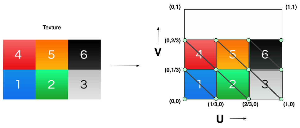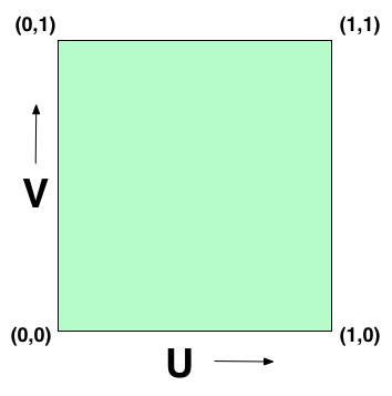 Texture coordinates are specified in texture space , which is simply the normalized range [0,1]. By convention, we use U and V as the axes of the texture space where U corresponds to the x-axis and V corresponds to the y-axis. OpenGL treats the values of the UV axes as going from left to right on the U axis and down to up on the V axis. Take a look at the following image: