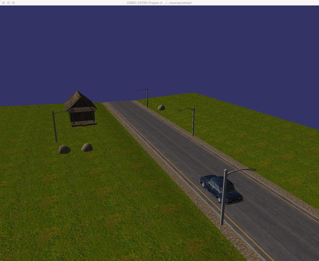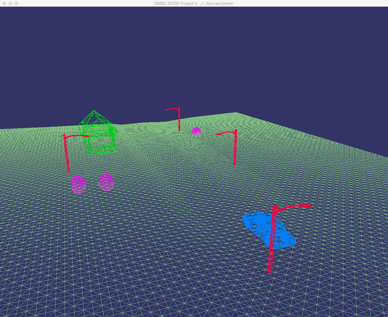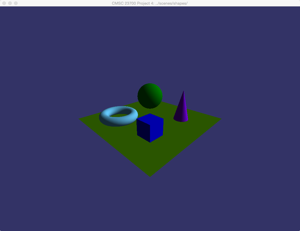 Here are screen shots for the sample scenes. We have included a view that shows the light-volume cones as a wire frame. This view is not something that you need to implement; rather, we include it to help you understand the geometry of the scenes. Click on the thumbnail to get the full image.