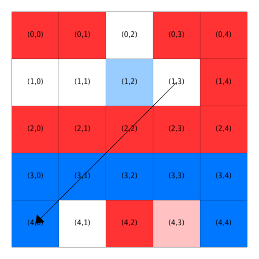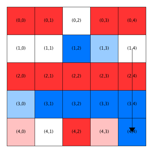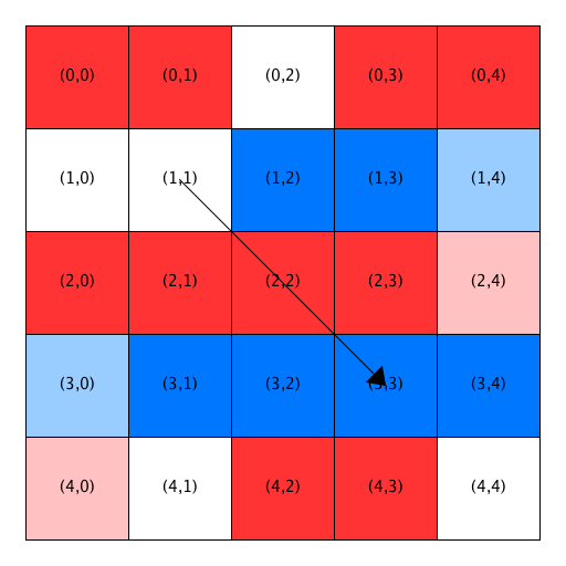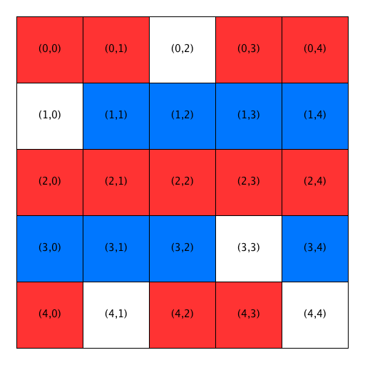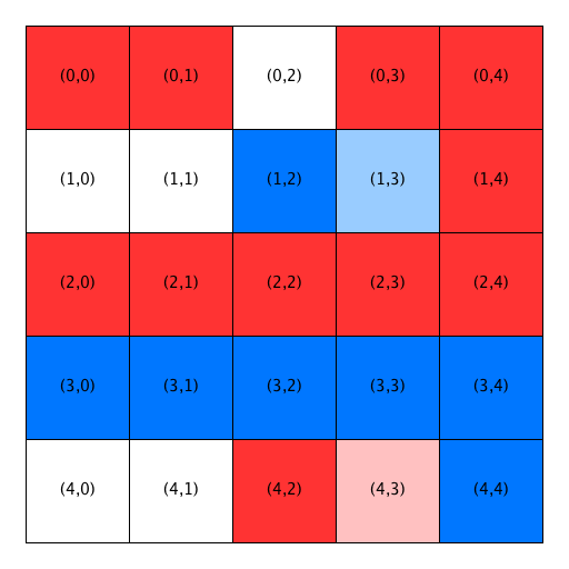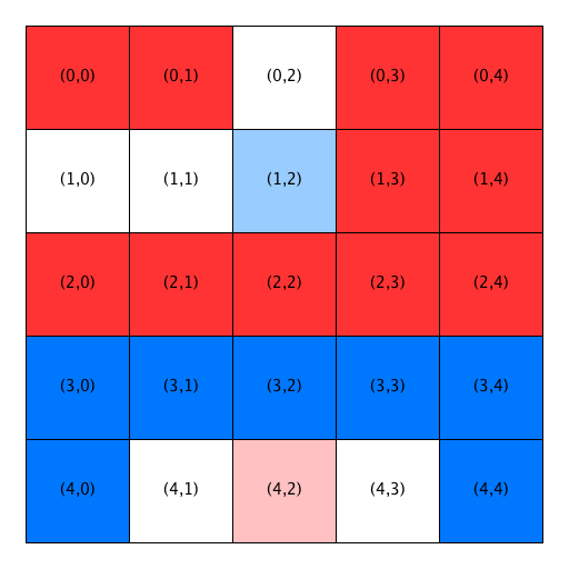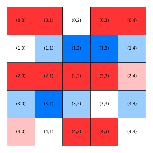 - The first two open locations are not satisfactory for the blue homeowner at (1,1), so he is relocated to Location (3,3). Notice that Location (3,3) has been removed from the list of open locations and Location (1,1) has been added to the front of the list. Also notice that the homeowners in Locations (3,2) and (3,4) become satisfied when a blue person relocates into the previously open home between them.