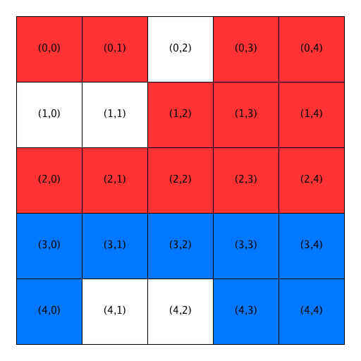 Cities: A city is represented as an \(N \times N\) grid (where the value of \(N\) can be different for each city). Each grid location (or cell) represents a home, which can be in one of three states: open (that is, unoccupied), occupied by a red homeowner, or occupied by a blue homeowner. You can assume that a city has at least one open location.