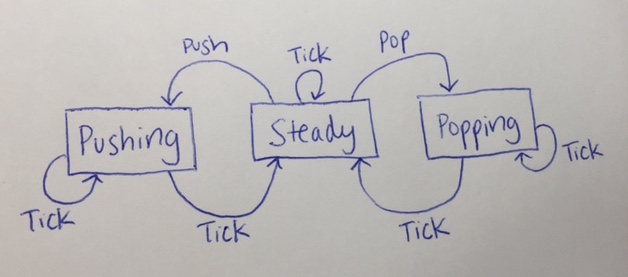 (M Pop, Steady) -> (stack, Popping now now (now + delay))