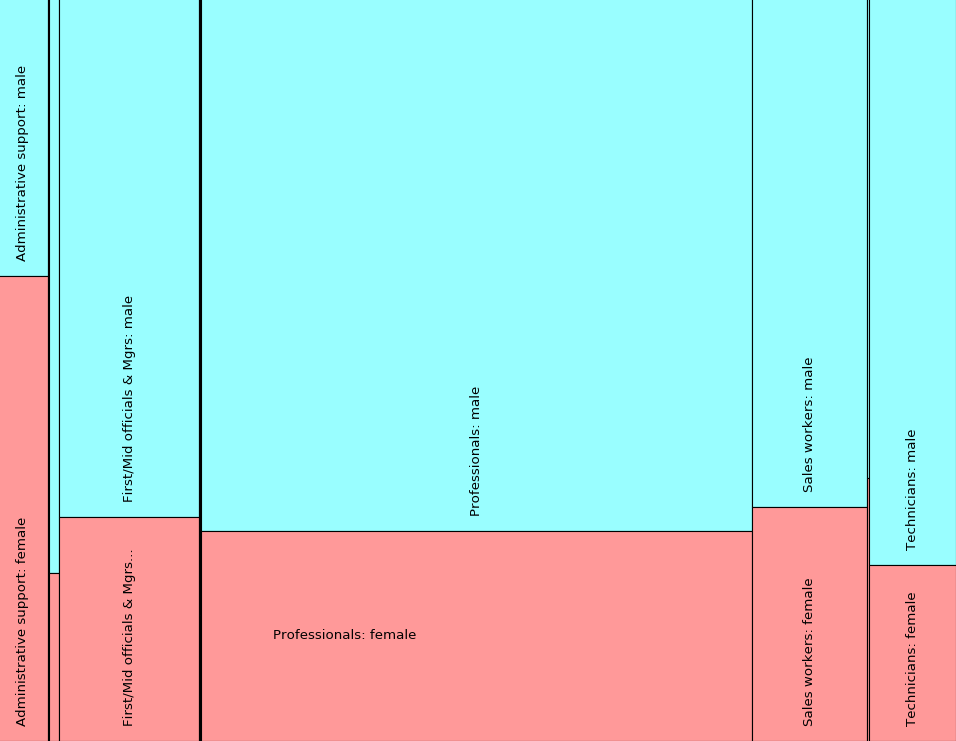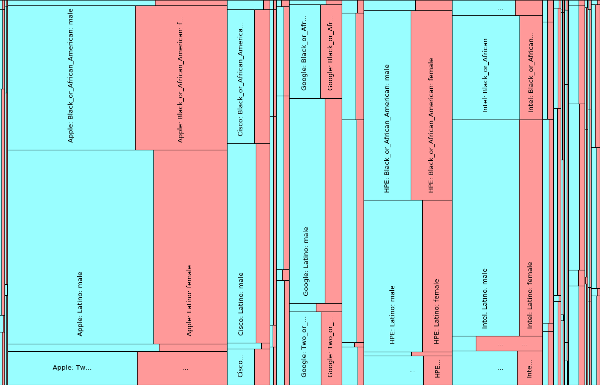 Looking at the data in this form, we can immediately see the proportion of males and females at each company, as well as how different Silicon Valley tech companies compare to each other in terms of gender diversity. The treemap also visualizes the relative size of the workforce at each company, showing that comparatively gender-balanced companies tend to have too small a workforce to even give them a legible label in the treemap.
