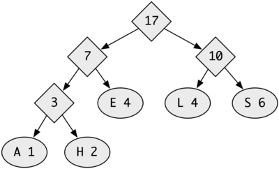 Running this algorithm on our example (SHESELLSSEASHELLS) produces the following tree: