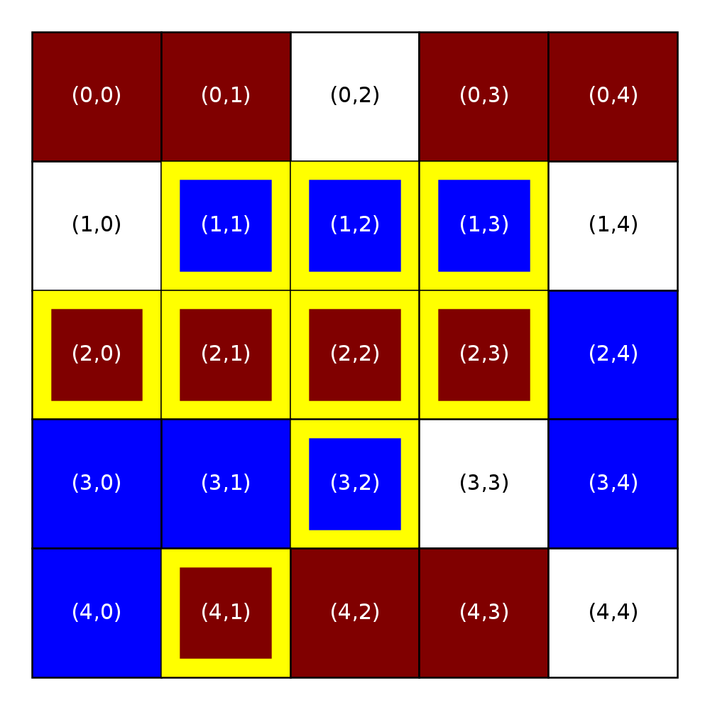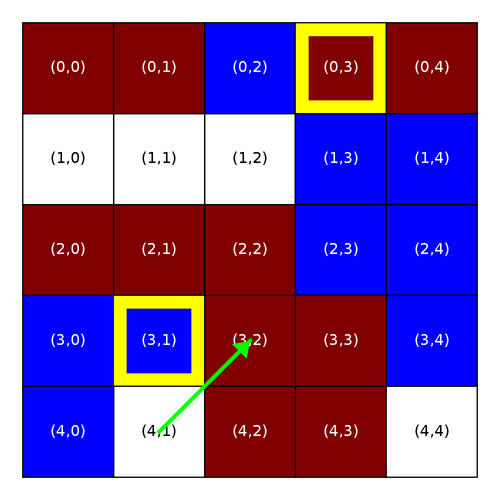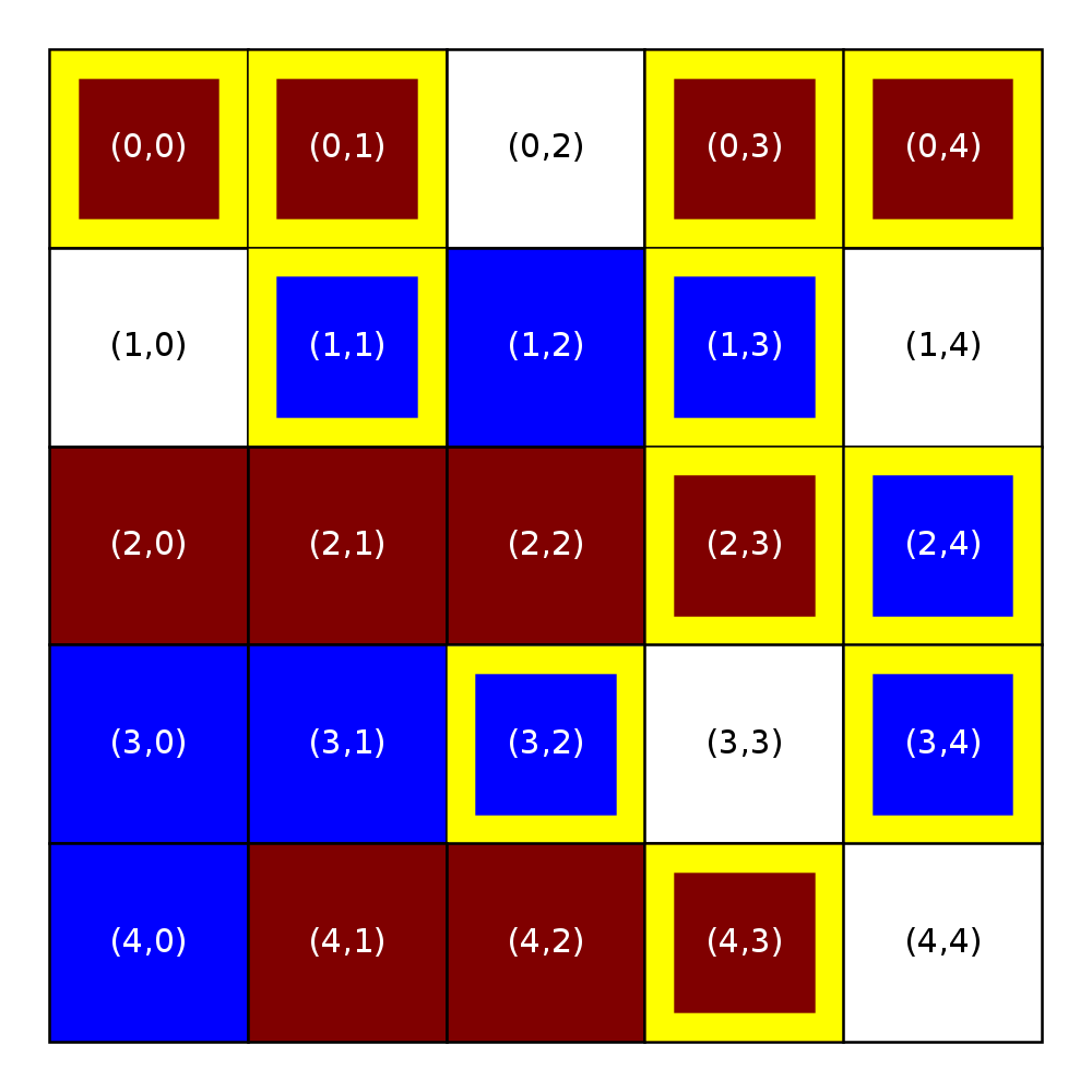 Here is an example relocation of the unsatisfied homeowner at Location (1,1) to Location (0,2). On the left, we show a city with R-1 neighborhoods in which the similarity threshold is 0.44 and the occupancy threshold is 0.5. Below the grid, we also include a depiction of the locations that are open in the neighborhood.