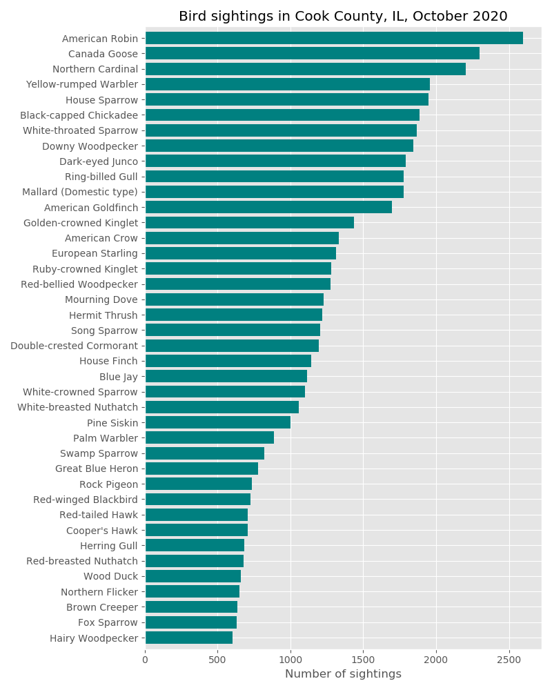 From this we can see the most commonly seen 2 bird species in Cook County in October 2020 was the American Robin. But there are some shortcomings to this visualization.