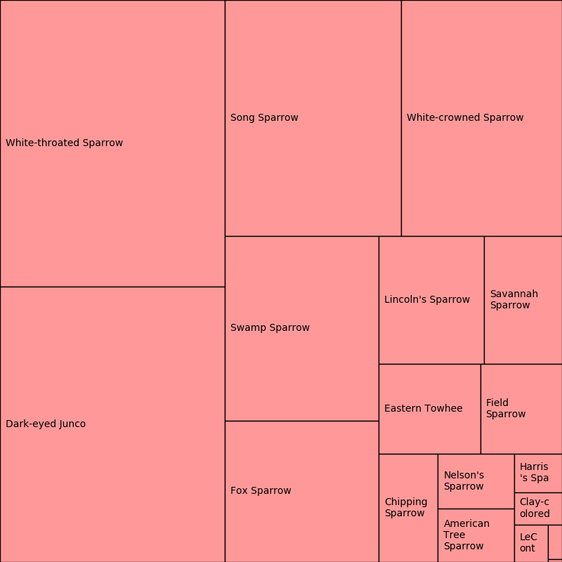Looking at the data in this form, we can immediately see that, for instance, the American Robin (near the center of the treemap) is more prevalent in the data than other species, but that sparrows (the group of boxes in the upper-left corner) as a whole are three to four times more prevalent than robins.