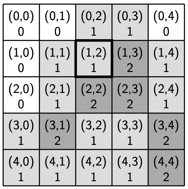 For example, say our sample region has a community center at location (1, 2) with service distance 1. The community center is shown above with a bold outline and its R-1 neighborhood is shaded in yellow. The SL-speaking homes at locations (0, 2), (0, 3), (1, 1), (1, 2), (1, 3), (2, 2) and (2, 3) are within the service distance of the community center, while those farther away are not. Again, community centers do not service DL-speaking homes.