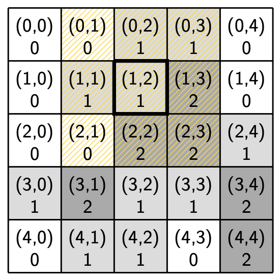 The following figures show the neighborhoods around locations (2, 2) and (3, 0) for different values of R. We use yellow to indicate that a location is included in the specified neighborhood and white to indicate that a location is not included in the neighborhood.