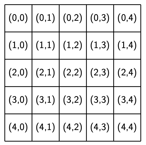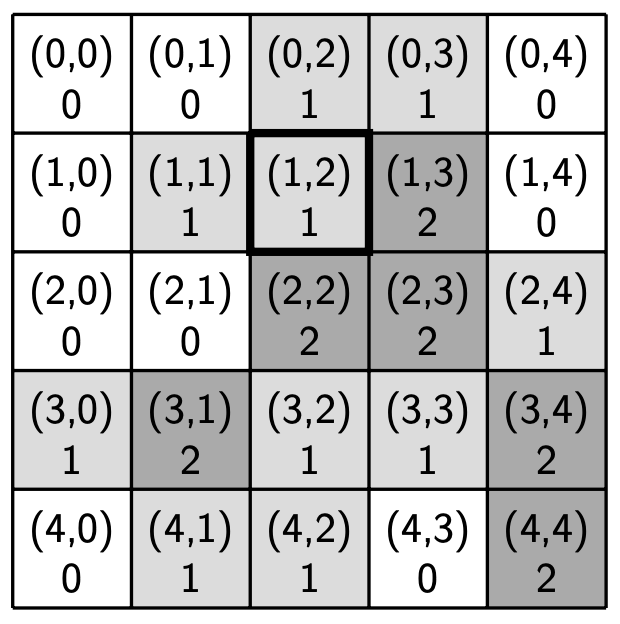 Here is a sample region with N = 5. This figure shows the location of each home (cell) in the region.