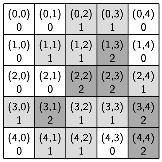 Here is a sample region with speakers that we will use throughout this write-up. A white cell indicates that a home is occupied by speakers in language state 0, a light grey cell indicates that a home is occupied by speakers in language state 1, and a dark grey cell indicates that a home is occupied by speakers in language state 2.