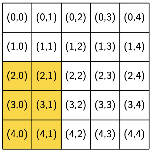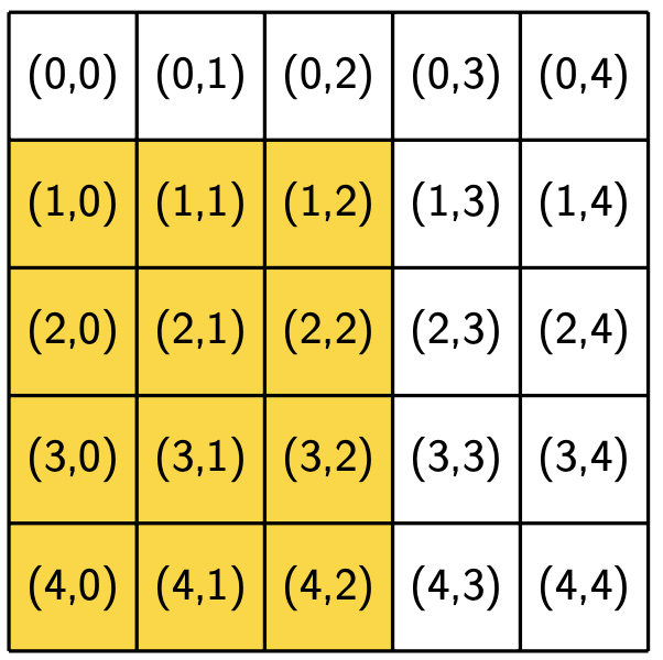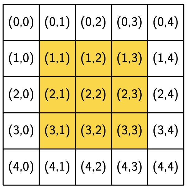 Notice that location (3, 0), which is closer to the boundaries of the region, has fewer neighbors for the same value of R than location (2, 2), which is the middle of the region. Also notice that location (i, j) is considered part of its own neighborhood.