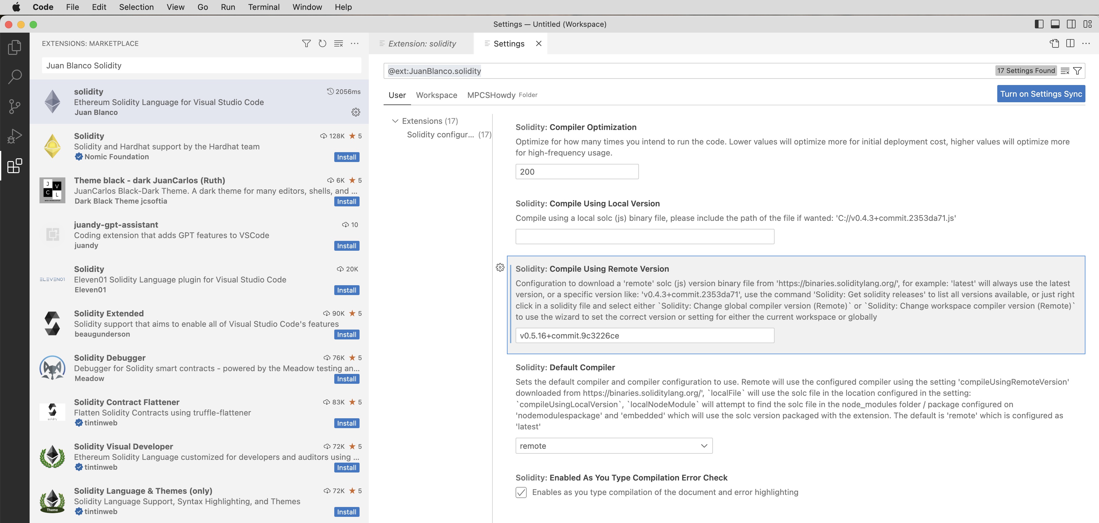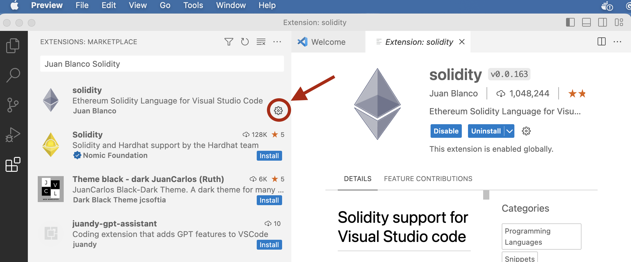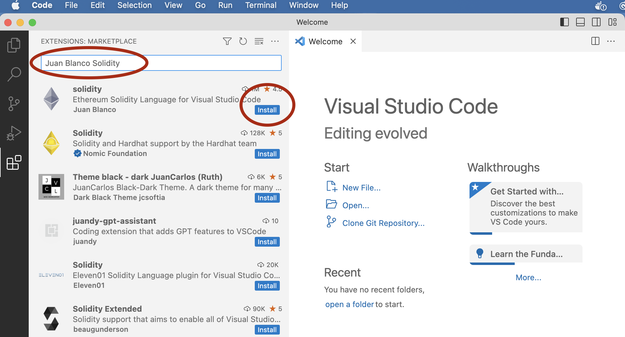 "Juan Blanco Solidity" into the Extensions: Marketplace search bar