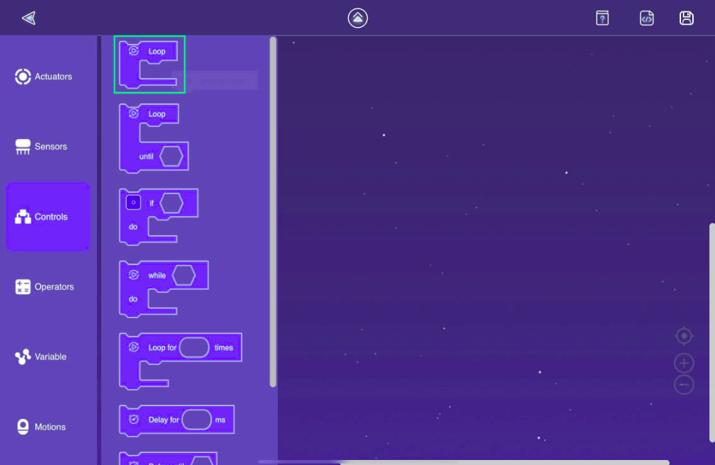 If you correctly follow the steps, you'll arrive at Clicbot's Blockly programming interface. At first, the interface will have only the "program start" block. All the blocks you need to program the Clicbot will be attached to this block.