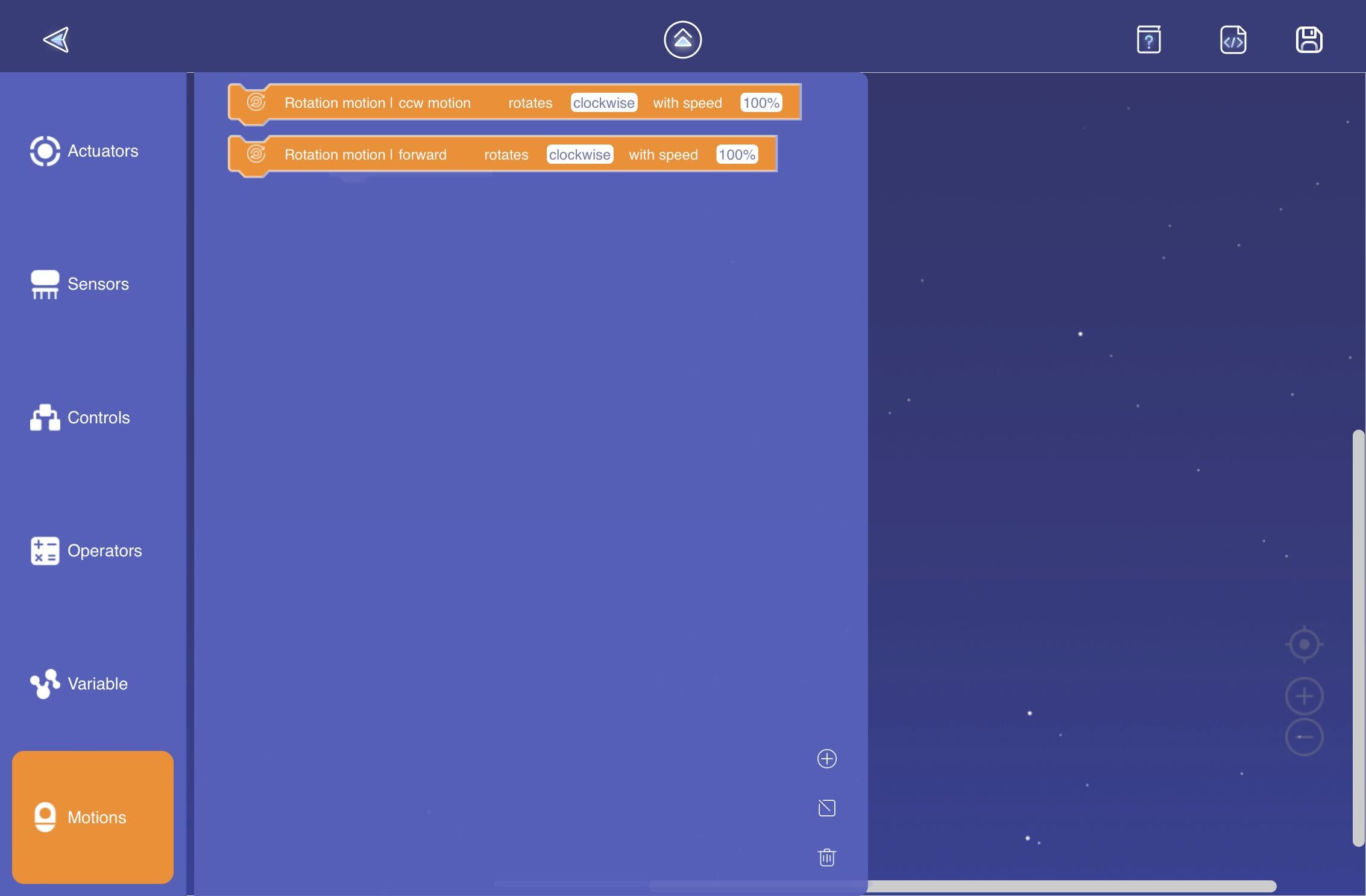 Now, open the Blockly programming interface for your four-wheeler Clicbot. Once the interface is loaded, navigate to the "Motions" menu in the toolbox.